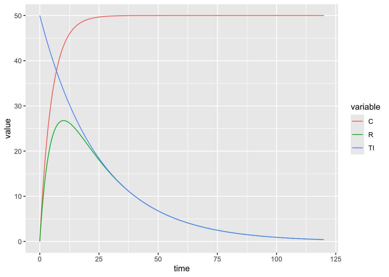 (exp(1)^ (-t/C)) - (exp(1)^ (-t/TI))